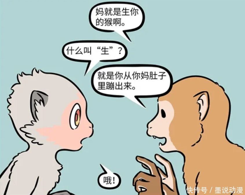 其中一只猴子跟孙悟空解释,妈就是生下孙悟空的那只猴子。那么什么叫“生”,孙悟空也知道。这只猴子很耐心,告诉孙悟空所谓“生”,就是他从他妈妈肚子里面蹦出来。听到这里,孙悟空似乎有点理解什么是“生”,什么是“妈妈”。